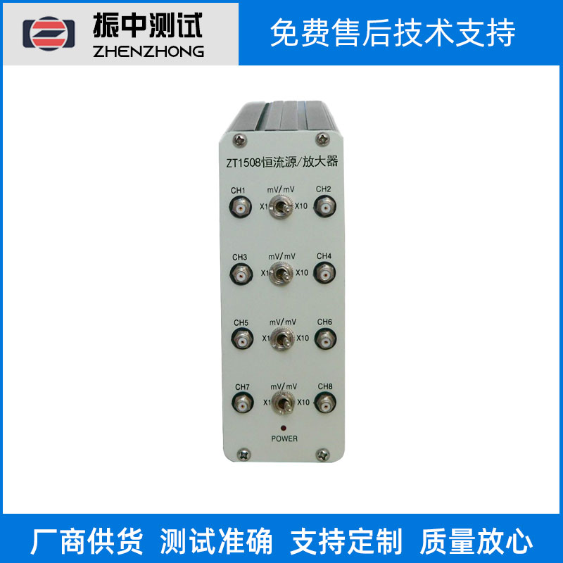 ZT1508型恒流源/放大器是一款為內裝電路型壓電傳感器提供激勵和放大功能的專用適調器。本儀器具有多通道、結構緊湊、性能可靠、使用方便等特點。可配接各種 ICP型傳感器如加速度計,力傳感器等,是機械量數據采集系統中重要環節之一。